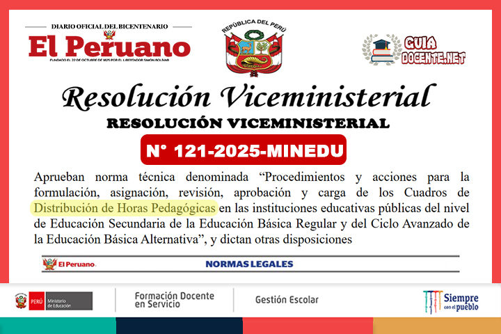 El día de hoy, compartimos con ustedes la Resolución Viceministerial N° 121-2025-MINEDU, que aprueba la norma técnica titulada “Procedimientos y acciones para la formulación, asignación, revisión, aprobación y carga de los Cuadros de Distribución de Horas Pedagógicas” para las instituciones educativas públicas del nivel de Educación Secundaria de la Educación Básica Regular y del Ciclo Avanzado de la Educación Básica Alternativa.
