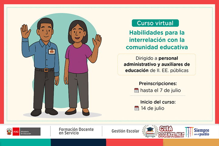 Dirigido a personal administrativo y auxiliares de educación de instituciones educativas públicas de la Educación Básica. Preinscripciones: hasta el 7 de julio. Inicio: 14 de julio.